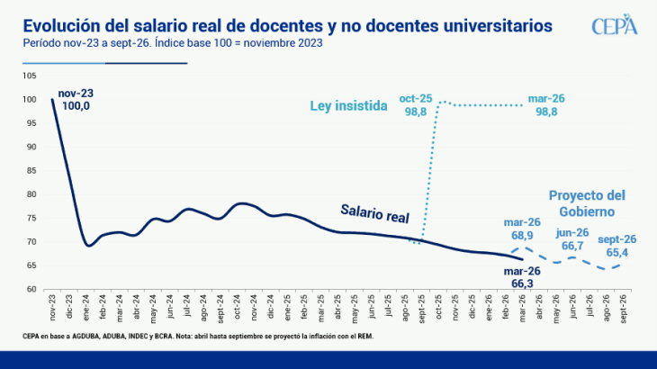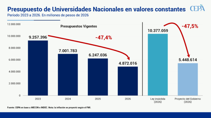 El ajuste no se limita a los salarios. Entre 2023 y 2026, el presupuesto de las universidades nacionales cayó un 47,4% en términos reales.