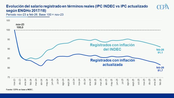 Desde el Centro de Economía Política Argentina (CEPA), señalaron que de utilizarse la canasta de 2017/8, la pérdida del poder adquisitivo de los salarios registrados entre noviembre 2023 y febrero de 2026 aumentaría, del 8,9% registrado hoy, a un 18,3%.