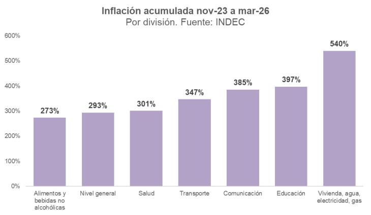 Para dimensionar por qué ahora este tema es particularmente relevante, cabe calcular cuál es la inflación acumulada desde la asunción de Milei a marzo de 2026 (293%) y compararla con las distintas divisiones del IPC.