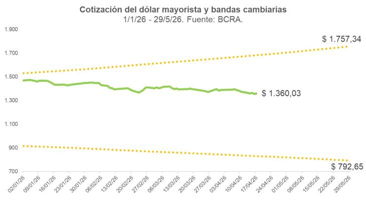 Por su parte, la banda inferior se ubicará a fines de mayo en $792,65. Así, el tipo de cambio tiene un margen para bajar superior al 40%.