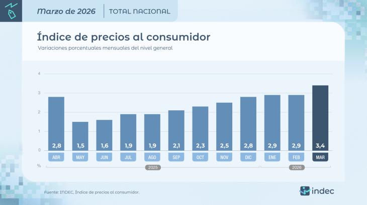 La inflación de marzo fue del 3,4% en Argentina, según informó el INDEC (Instituto Nacional de Estadística y Censos). El dato se ubicó por encima de febrero (2,9%) y constituye el índice más alto del último año. De esta manera, acumula diez meses consecutivos en que la inflación no desacelera respecto del mes previo. A su vez, fue el salto más relevante de un mes a otro (+0,5 puntos porcentuales).
