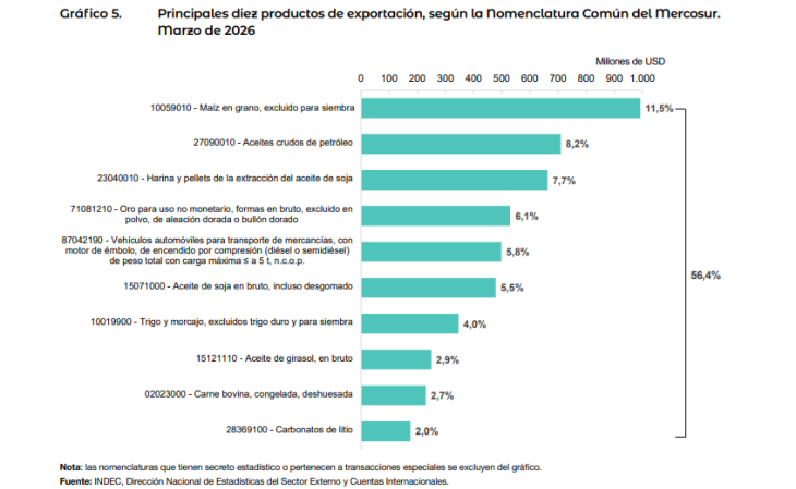 Los 10 principales productos de exportación de nuestro país fueron en marzo: maíz, petróleo, oro, harina y pellets de soja, vehículos para transporte de mercancías, trigo, aceite de soja, carne vacuna, carbonato de litio y aceite de girasol.