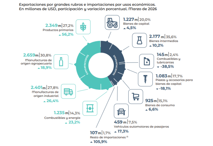 Combustibles y energía, por último, aumentaron 23,2% en relación a marzo de 2025, alcanzando los USD 1.235 millones, el valor más alto registrado.