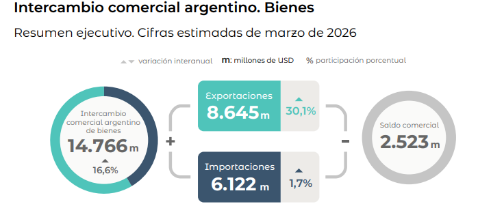 En marzo de 2026, la balanza comercial argentina logró un superávit de USD 2.523 millones, USD 1.900 millones más que el mismo mes de 2025, de acuerdo con datos oficiales de INDEC. Ello fue posible pese a que las exportaciones argentinas treparon 30,1% mientras que las importaciones solo recuperaron 1,7%, incluso en bienes de consumo, luego de 17 meses de crecimiento.