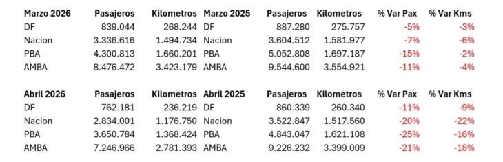 Los datos corresponden a la Asociación Argentina de Empresarios del Transporte Automotor (AAETA) y comparan los primeros 15 días de abril de 2026 contra el mismo período de 2025. En términos absolutos, los viajes pasaron de 8,4 millones a 7,2 millones.