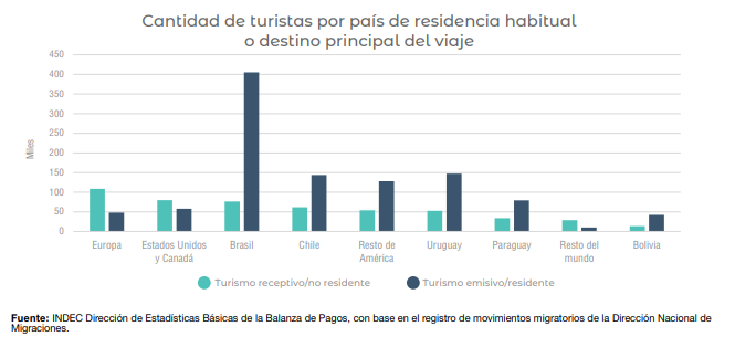 Los principales destinos de viaje fueron los vecinos, encabezado (por lejos) por Brasil (405 mil), seguido de Uruguay (147 mil) y Chile (144 mil).