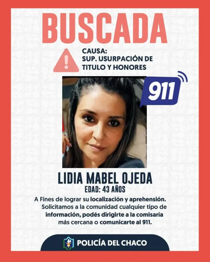 Luego de que se conociera el caso de una mujer que se hacía pasar por médica y atendía en dos hospitales del Chaco, la justicia provincial libró la captura nacional de Lidia Mabel Ojeda, y es buscada intensamente. La falsa médica atendía pacientes utilizando la matrícula de otro profesional de la salud.