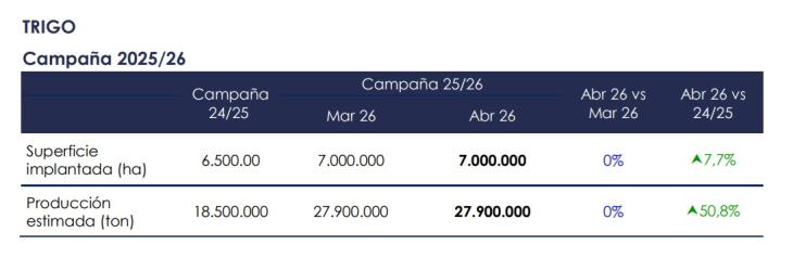 Este volumen de cosecha obtenido por el cereal posicionó a la campaña 2025/26 como la mejor en toda la historia del cultivo. En la comparativa, el mejor registro previo fue en la 2021/22, con una producción de 22,1 millones de toneladas.