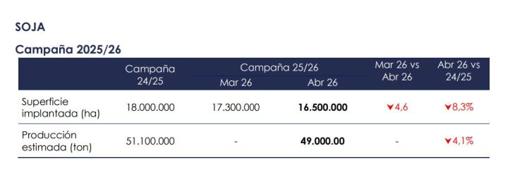 La soja presenta una reducción interanual en la producción y para la campaña 2025/26 se estiman 49 millones de toneladas, por debajo de las 51,1 millones de la campaña anterior. La superficie implantada también disminuyó a 16,5 millones de hectáreas.