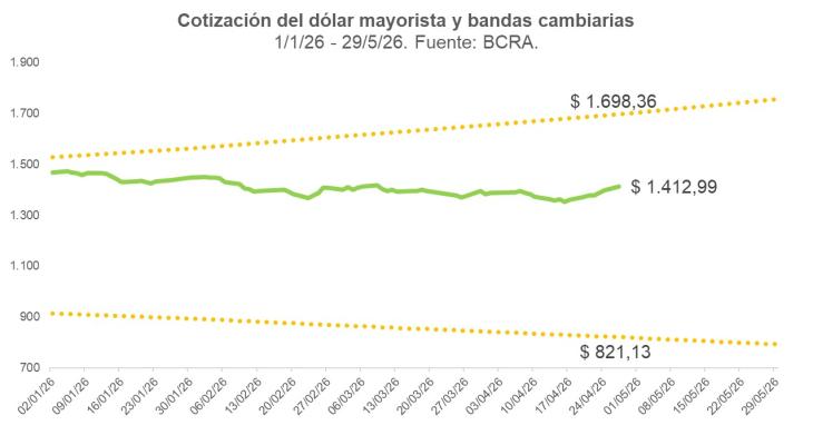 En promedio, en la rueda se operó a $1.412,99, según Comunicación “A” 3500 del BCRA, a $285,37-o 20,2%- del techo de la banda cambiaria, ubicado hoy en $1.698,36. Respecto al piso mínimo del 16 de abril, el tipo de cambio trepó 4,4%.