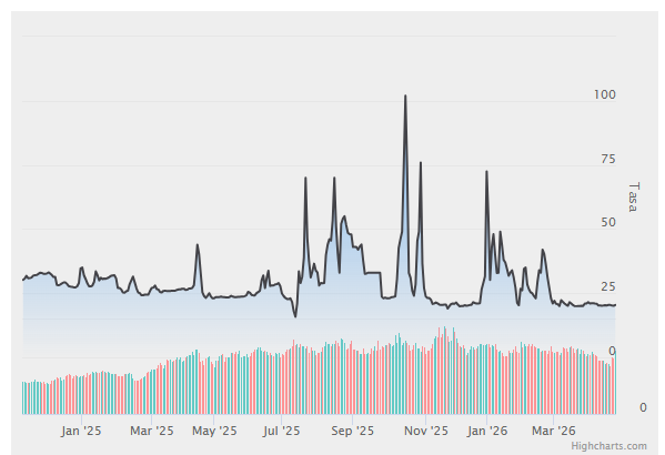 Por su parte, la tasa de caución a un día en pesos promedió el 20,4% anual, en línea con el corredor de tasas establecido por el BCRA, con un piso en 20% (pases pasivos) y un techo en 25% (pases activos).