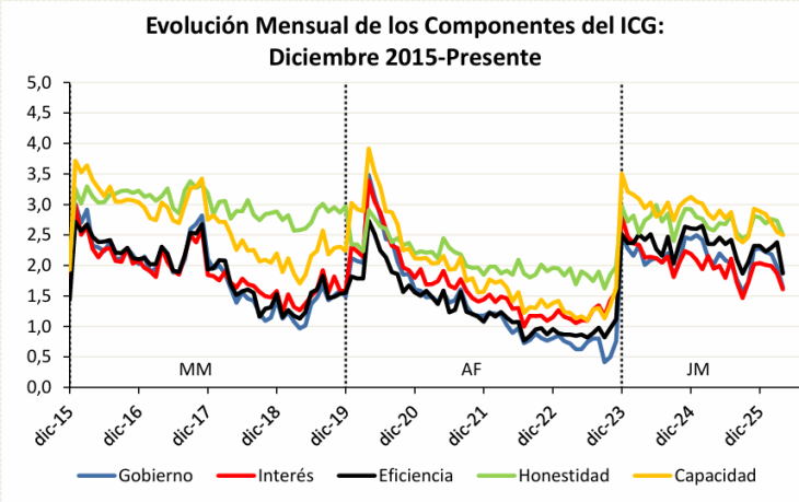 La medición se construye sobre cinco ejes de desempeño. En abril, los cinco componentes registraron sus valores más bajos en lo que va de 2026. El ítem que mide la Eficiencia en la administración del gasto público sufrió la contracción más violenta, con una caída del 21,4%. Detrás se ubicaron la Evaluación general del gobierno (-17,2%) y la Preocupación por el interés general (-13,9%).