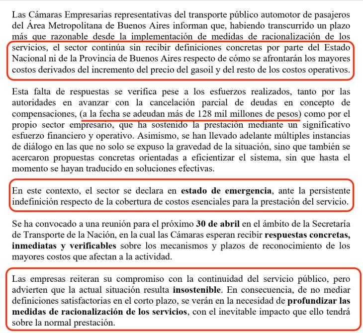 En paralelo al aumento, el conflicto con las empresas del sector suma tensión. Las cámaras de transporte del AMBA advirtieron que, si no hay definiciones sobre el financiamiento del sistema antes de fin de mes, la frecuencia podría reducirse de manera drástica.
