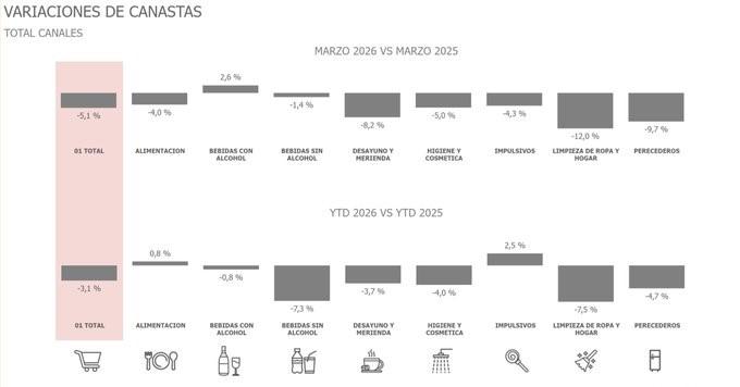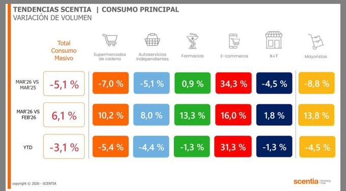 De acuerdo con datos de Scentia, el consumo masivo retrocedió 5,1% en relación a marzo del año anterior. Acumula así un primer trimestre con una baja de 3,1% respecto al mismo período de 2025.