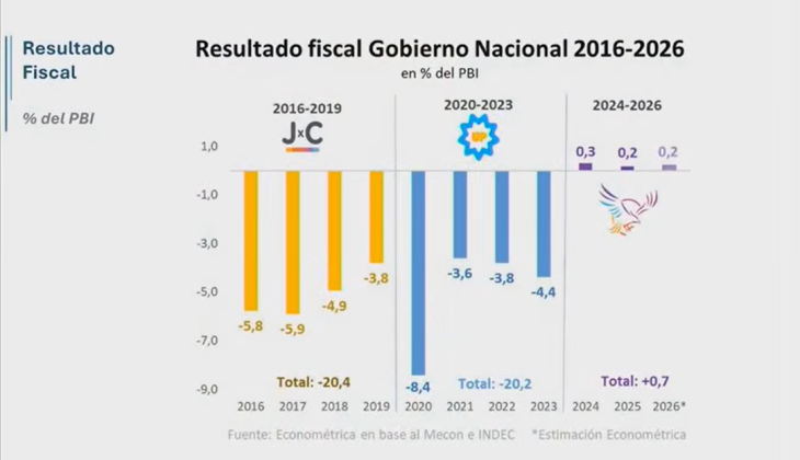 El primer gráfico presentado por Milei reflejó el comportamiento fiscal, donde se observaba un déficit persistente durante la gestión de Cambiemos, con una mejora recién en el último año, ya con el FMI auditando severamente las cuentas públicas.