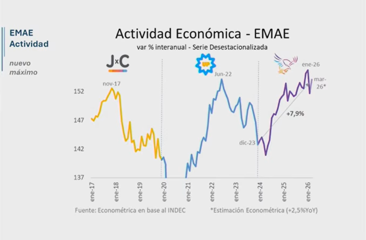 El tercer gráfico exhibido durante la presentación abordó la evolución de la actividad económica. Allí, Milei marcó caídas en los niveles de actividad durante los años finales del gobierno de Macri, especialmente en 2018 y 2019 a partir de la crisis cambiaria y la aceleración inflacionaria.