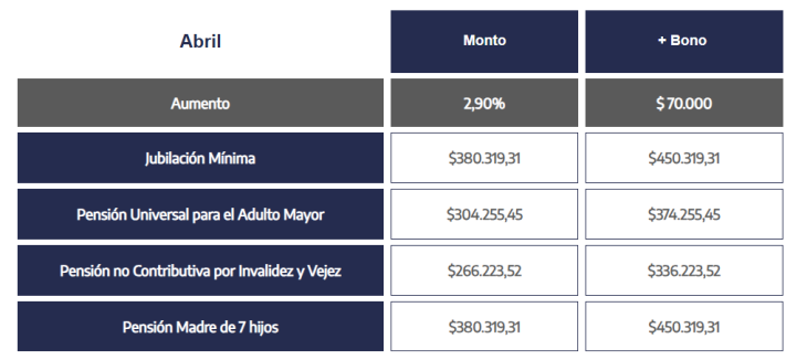 El haber mínimo de abril es de $380.319,31 y se suma el bono de $70.000, que el Gobierno mantiene congelado desde hace dos años. De esta forma, el ingreso total alcanza los $450.319,31.