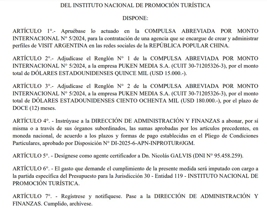El Instituto Nacional de Promoción Turística (INPROTUR), organismo depende del Gobierno de Javier Milei, adjudicó un contrato por casi US$ 195.000 para la creación y administración de perfiles de redes sociales de “Visit Argentina” en la República Popular China. La contratación recayó en la empresa Puken Media S.A., lo que equivale a aproximadamente $238.875.000 según la cotización de $1.225 por dólar.