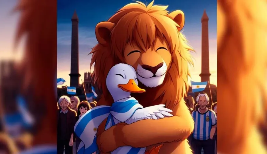 Tras el anuncio oficial de Patricia Bullrich de apoyar a Javier Milei en el balotaje contra Sergio Massa, el líder de La Libertad Avanza hizo un curioso posteo en sus redes sociales con una imagen de un pato y un león abrazados rodeados de personas con banderas argentinas y camisetas de la selección.