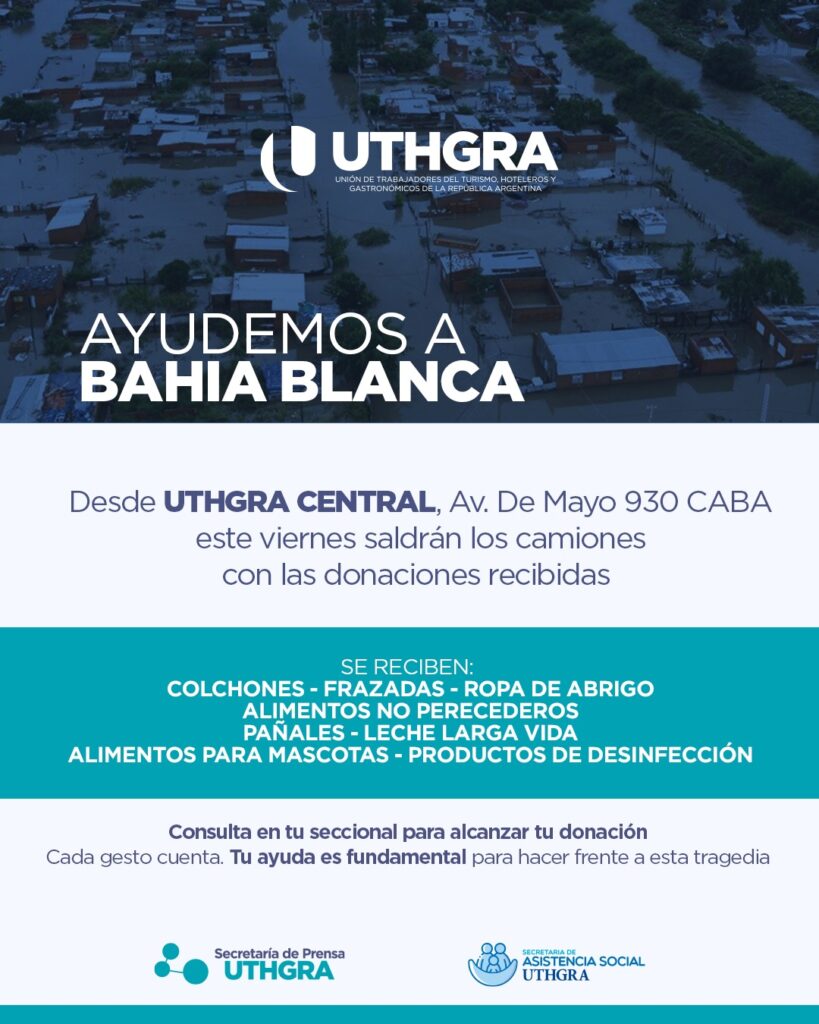 La Unión de Trabajadores del Turismo, Hoteleros y Gastronómicos de la República Argentina (UTHGRA) inició una campaña para asistir a las familias damnificadas por el trágico temporal en Bahía Blanca.